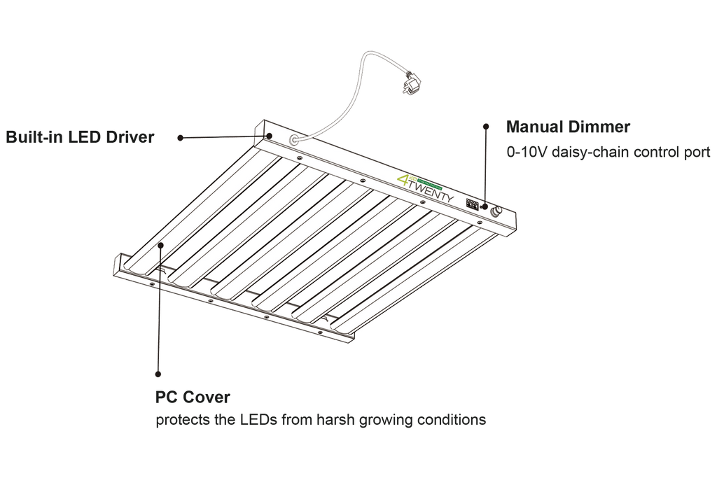 Der 420 X5 Spider von 4Twenty ist ein leistungsstarkes LED-Wachstumslicht mit einer beeindruckenden Effizienz von 2,7 μmol/J. Dank der hocheffizienten 3000K- und 6500K-Samsung-LM281B+-LEDs in Kombination mit 660-nm- und 730-nm-LEDs von OSRAM bietet diese Lampe ein volles Spektrum mit einem breiten Strahl und einer starken Lichtdurchdringung bis zu den unteren Knospen.